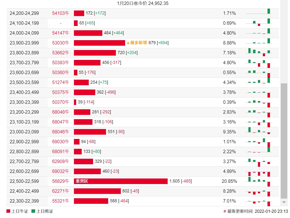 牛证街货重货区在22500-22599区间,该区间最新牛证数量为1605张,较上一交易日减少485张;最多新增在23900-23999区间,该区间最新牛证数量为879张,较上一交易日增加694张。