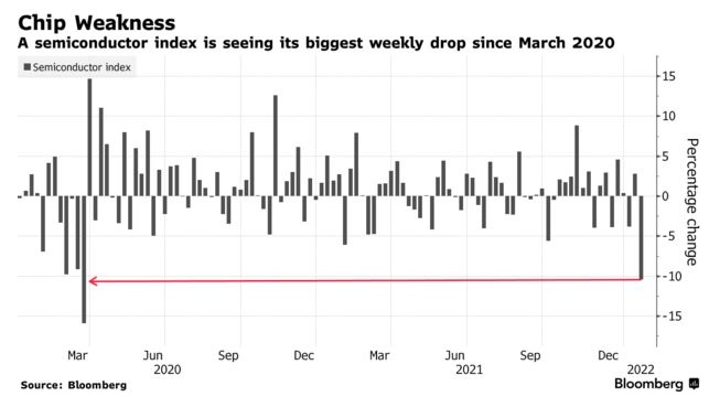 费城半导体指数下跌3.3%,收于去年10月底以来的最低水平。该指数本周迄今已下跌超过10%,这将是自 2020 年3月以来的最大单周百分比跌幅。目前该指数较12月的峰值下跌了 13%。