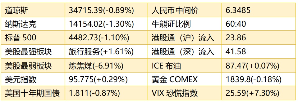 1.隔夜美股截至收盘,道指跌313.26点,跌幅0.89%,报34715.39点;纳指跌186.23点,跌幅1.30%,报14154.02点;标普500指数跌50.03点,跌幅1.10%,报4482.73点。港股ADR指数小幅下跌,按比例计算,收报24817点,跌135.08点或0.54%。