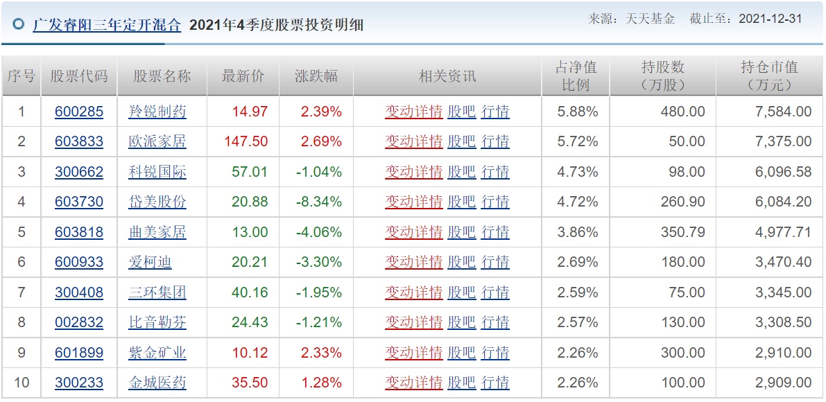 广发睿阳三年定开为其现任基金规模最小的一只,仅12.9亿,股票仓位占基金总资产比例为53.49%较前一季度末的52.04%略有增加。截止1月20日,该基金单位净值为1.0598元,环比上季度增长8.19%,累计净值为2.0551元。