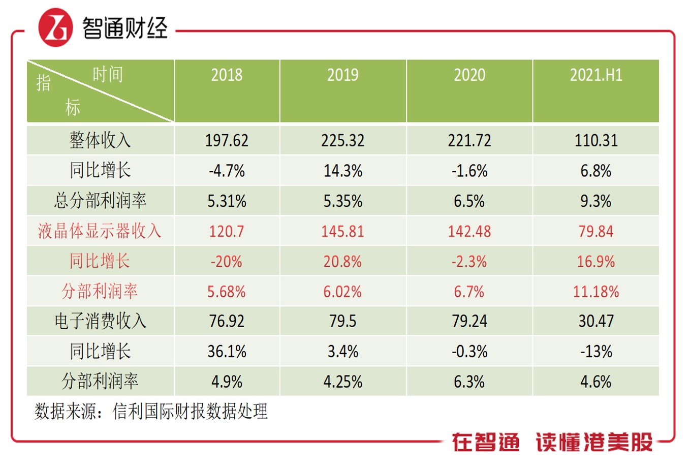 该公司的液晶体显示器产品,主要为TFT-LCD类别、OLED类别及触控屏产品,而电子消费产品,主要包括微型相机模组、指纹识别模组、个人保健产品及电子设备,液晶体显示器占收入大头,收入份额超过70%。2021年上半年液晶体显示器收入增长16.9%,贡献收入增量180%,车载TFT-LCD产品贡献最大,产能开始释放。