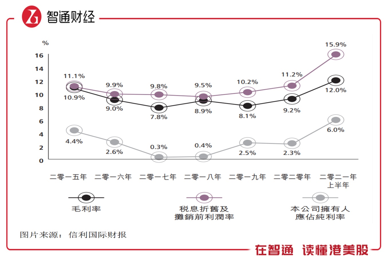 不可否认,信利国际近几年收入并不好看,但上文已详细谈到该公司业务及产品结构上的变化,从历史上看,正逐年改变公司的盈利水平。2017年开始,公司的毛利率、EBITDA及股东净利率水平基本都触底回升,2021年上半年三项指标分别为12%、15.9%及6%,分别较2017年度提升4.2、6.1及5.7个百分点,首三季保持稳定。