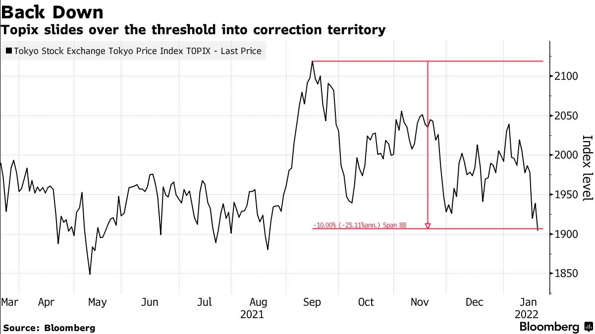 智通财经APP获悉,由于人们对美国货币政策收紧风险及全球新冠疫情的担忧,日本东证指数将跟随以科技股为主的纳斯达克100指数进入回调。截止发稿,日本东证指数下跌1.32%,从去年9月该指数创31年来最高点后,下跌了10%。纳斯达克100指数周四收跌1.34%,而标普500指数仍较今年1月份高点下跌逾5%。