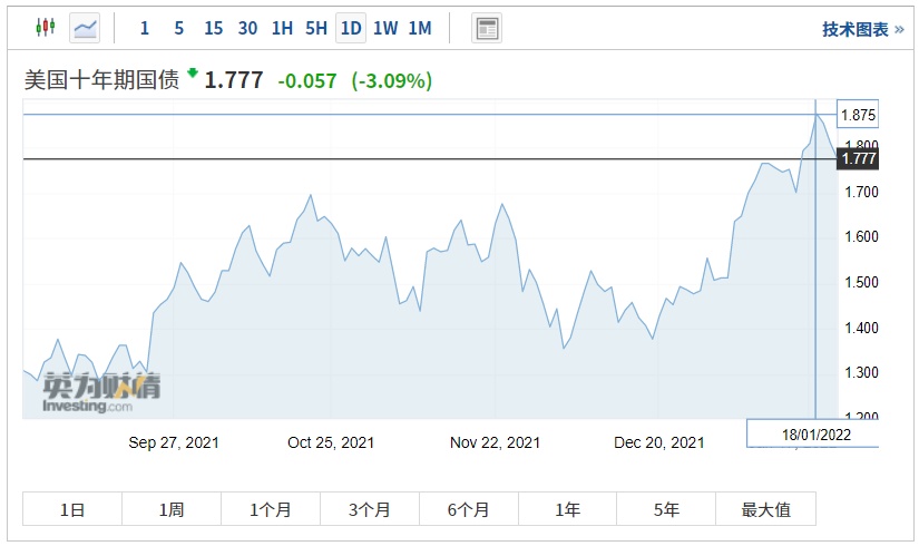 值得注意的是,近期随着通胀上涨,Omicron变体迅速扩散,美债十年期国债收益率曾于本周二一度站上1.9%的高位关口,创两年来新高。