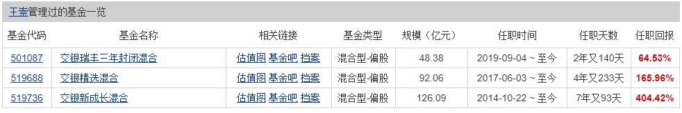 在王崇在管的三只基金中,交银新成长混合管理资产规模最大,达126.09亿元。其后是交银精选混合92.06亿元,交银瑞丰三年封闭混合48.38亿元。其中,交银瑞丰三年封闭混合主要投资渠道包括A股和港股市场,交银精选混合和交银新成长混合主要投资A股市场。