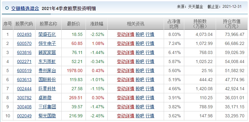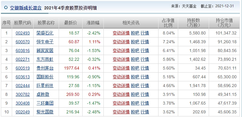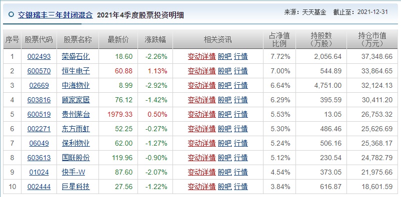 具体来看,截至2021年末,该基金的前二大重仓股荣盛石化(002493.SZ)、恒生电子(600570.SH)分别获一定幅度的加仓。港股的保利物业(06049)、快手-W(01024)等个股获得较大幅度加仓。