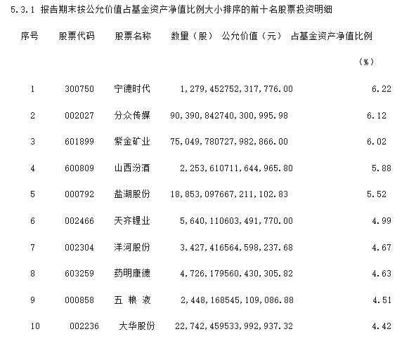 与三季度末相比,赣锋锂业(002460.SZ)、三峡能源(600905.SH)、汇川技术(300124.SZ)、通威股份(600438.SH)、隆基股份(601012.SH)、科达利(002850.SZ)退出其前十大重仓股,山西汾酒、盐湖股份、天齐锂业、洋河股份、药明康德、五粮液新晋前十大重仓股。