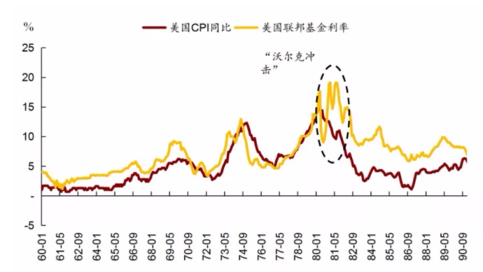 图1:美国工资和物价开始出现“螺旋上升”的迹象 资料来源:WIND、亚特兰大联储,中金公司财富研究 上世纪70年代的大滞涨给我们的启示是,在通胀出现初期,由于当时美联储担心经济下滑,对通胀采取容忍的态度,在长达10多年的时间内,工资和物价形成循环,不断自我实现,造成治理通胀的成本越来越大。通胀在1960年中后期已经明显抬头,但是一直等到1980年里根当选总统后,通胀率已经超过14%,才终于下决心解决。1980-82年美联储主席沃尔克把联邦基准利率升到接近20%,明显超过通胀率,制造出一场经济衰退,才将通胀控制住。因此,美联储货币政策急速转向是吸取了历史经验和教训的。从民主党执政的现任政府角度来看,控制通胀也是宜早不宜晚。如果推迟到2023年甚至更晚再行动,通胀峰值就可能进一步升高,控制通胀对经济和社会的冲击幅度也会更大,甚至影响到美国2024年的总统选举。然而,要在经济繁荣的情况下大幅降低通胀预期是非常困难的,货币紧缩很有可能导致一定程度的经济衰退。 图2:美国的通胀和利率(1960-1990) 资料来源:WIND、中金公司财富研究 然而,即使美联储今年采取果断的紧缩政策,造成一定程度的经济衰退,我们相信这一衰退也是相对短暂的。与1970年代的通胀相比,当前的通胀水平更低、持续时间也更短,通胀预期没有当时那么强;美国的财政刺激力度也在减退,这为降低通胀会起到有利作用;最重要的是,当前美国私人部门的杠杆率仍不是很高,即使美联储加息导致经济衰退,也不太可能导致像2008年次贷危机一样的漫长的“资产负债表衰退”,而更有可能出现像2018年一样的短期衰退。 01 美联储加息会对美国资本市场造成什么影响? 在美联储开始加息的过程中,宏观环境通常会经历前后两个周期阶段。 ** 第一个阶段是加息的前半段,利率仍比较低,对经济和通胀的抑制作用比较小,企业的收入和利润仍会保持增长。 ** 第二个阶段是随着加息周期进入后半程、企业融资成本不断上升,实体经济的总需求就会从扩张转向衰退。 在这两个阶段,资本市场的表现也是截然不同的, ** 在第一阶段,股票、房地产等风险资产总体上涨,而债券表现不佳; ** 而第二阶段则会迎来股债表现的逆转,长久期利率债将成为最优资产。 目前,无论是从利率水平,还是景气指标来看,美国经济仍然处于“第一阶段”,但最重要的问题是“第二阶段”什么时候会到来?在1970年代,美联储花了十年都没有驯服通胀,接下来会出现类似的情况吗? 从次贷危机以来的历史来看,在老龄化、贫富差距加大、居民部门去杠杆等背景下,需求不足和产能过剩是各国经济的主要矛盾,美联储收紧政策、有时候甚至只是通过加息的“预期管理”,就很容易就导致需求减少、通缩压力加大。在2016-18年的加息周期中,美联储将联邦基金利率加到2%以上之后(美债利率最高达到3%),经济就进入了衰退(这和当时的中美贸易战也有一定关系);再比如2012年下半年,美联储主席开始讨论缩表,美债利率就在次年升高到3%以上,经济随后也出现了景气下降(也和中国2013-14年的去杠杆有关系)。当前,全经济仍有很大不确定性,美联储加息的预期可能抑制经济活动。按照历史经验,美联储的政策利率在2%以上、或者10年期国债利率在3%以上时,经济衰退的迹象就会更加明显。 美国股市在2018年下跌20%。在过去两年,货币宽松、财政刺激、经济复苏的宏观环境,对权益资产是最为有利的周期阶段,美股经历了明显的涨幅、估值达到了仅次于90年代末期的水平。欧洲、日本等其它发达国家股市也出现了明显上涨。当前货币政策开始转向、财政刺激力度下降。往后看,随着利率逐渐升高,经济增长面临的不利因素也在加大。在此环境下,利率从低位回升虽然不一定立刻导致经济衰退,但对高估值的美股的影响将会逐渐加大。在上一次加息周期临近尾声时(2018年10月),经济动能明显减弱,美股经历了两个多月的调整,跌幅约为20%,直到该年底美联储明显放松政策措辞、暗示停止加息,并于次年开始降息才扭转了市场情绪。如果投资者在组合中的仓位比较高,那么当前是一个适合进行再平衡的时点,我们建议对其进行适度低配美国股票类资产。 02 美联储加息对中国市场的影响 中国经济能否再一次担负稳定全球经济的重任。在美国因为通胀而要开始紧缩政策的同时,中国需要适当宽松货币政策来提振和稳定经济增长。这种内外政策倾向背离的情况下,中国投资者应该如何抉择呢?历史上看,中美经济和政策不同步的情况时有发生,而中国的影响和作用越来越大。 ** 比如2008-09年,美国虽然推出了QE计划,但仍在经历居民部门的去杠杆、其贷款违约潮要到2010年才见顶。是中国当时率先进行大规模刺激,不仅促进了国内经济复苏,也带动了全球的增长,从而引领了全球股市的反弹。 ** 又比如2015年,美国经济表现比较好,即将进行次贷危机以来首次加息,同期中国出现明显的通缩压力,正在宽松货币稳定经济。事后来看,中国经济又一次对全球产生了巨大影响:全球市场先是随着中国通缩压力加剧而在2015年下半年下跌、又随着2016年中国经济企稳回升而上涨,美联储更是将加息计划搁置了一年才重新启动。 从历史中可以看到,随着中国经济规模越来越大,中国的经济和政策完全有可能对冲美联储的政策,不仅是国内市场的决定性因素,甚至反过来对全球