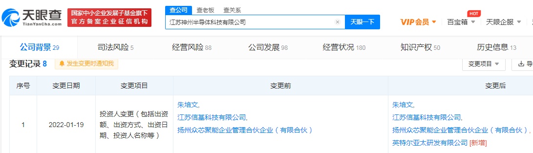 智通财经APP获悉,天眼查App显示,江苏神州半导体科技有限公司(下称:神州半导体)发生工商变更,股东新增英特尔亚太研发有限公司。