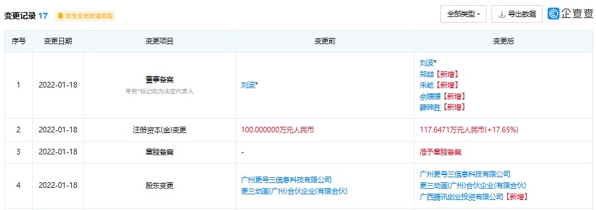 智通财经APP获悉,企查查App显示,广州更号三文化传播有限公司近日发生工商变更,新增股东广西腾讯创业投资有限公司,同时企业注册资本增至约117.65万人民币。据公开资料显示,广州更三动画成立于2017年5月,是一家集动画IP研发、动画制作、影视CG制作、影视特效制作、VR动画制作等为一体的动画内容开发公司。