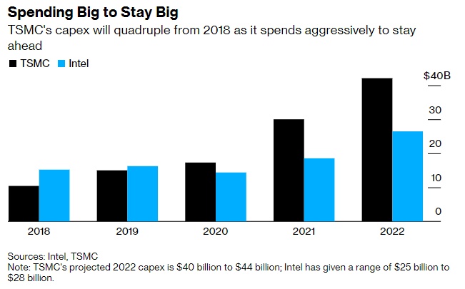 据媒体报道,台积电今年已拨出逾400亿美元用于资本支出,相比之下,英特尔资本支出预算高达280亿美元。据悉,三星电子可能会在1月27日的业绩报告中公布其2022年计划,分析师普遍预计,公司预算约为360亿美元。