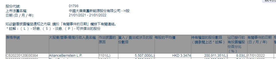智通财经APP获悉,香港联交所最新资料显示,1月17日,AllianceBernstein L.P.增持大唐新能源(01798)550.70万股,每股作价3.3474港元,总金额约为1843.41万港元。增持后最新持股数目约为2.01亿股,最新持股比例为8.03%。