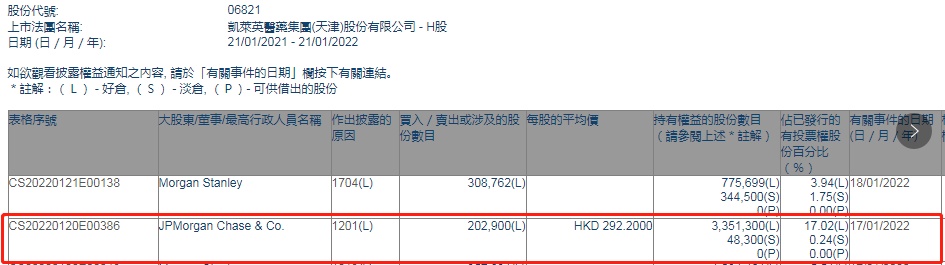 智通财经APP获悉,香港联交所最新资料显示,1月17日,小摩减持凯莱英(06821)20.29万股,每股作价292.2000港元,总金额约为5928.74万港元。减持后最新持股数目为335.13万股,最新持股比例为17.02%。