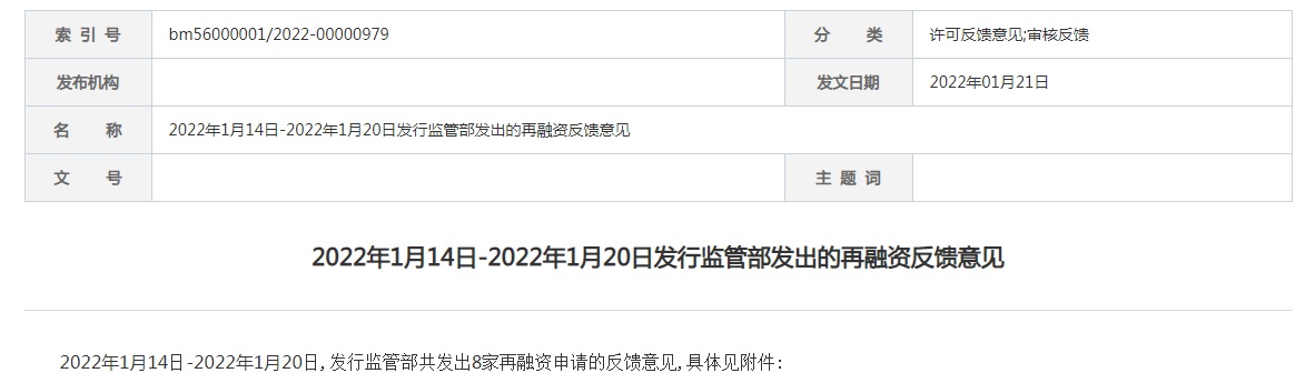 2022年1月14日-2022年1月20日,发行监管部共发出8家再融资申请的反馈意见,具体如下: