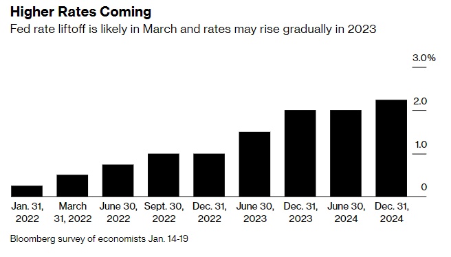 在1月14日至19日接受Bloomberg咨询与访问的经济学家中,预计美联储将在2022年加息三到四次的人大致各占一半,他们认为美联储已下定决心应对美国劳动力市场走强和近40年来最高通胀率。