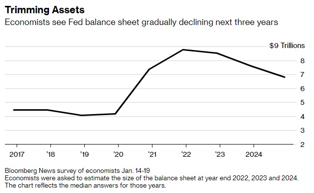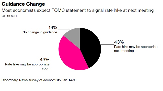 经济学家们普遍认为美联储官员将在下周的会议上暗示于3月进行三年多以来首次加息25个基点,并在不久之后开始缩减资产负债表。