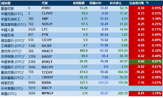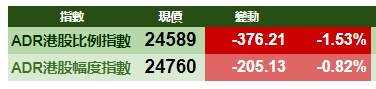 智通财经APP获悉,周五美股三大指数集体收跌,港股ADR指数下跌,按比例计算,收报24589点,跌376.21点或1.53%。