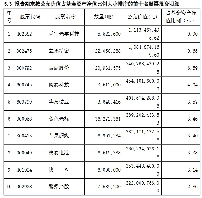 报告显示,该基金前十大重仓股为舜宇光学(02382)、立讯精密(002475.SZ)、盐湖股份(000792.SZ)、闻泰科技(600745.SH)、华友钴业(603799.SH)、蓝色光标(300058.SZ)、芒果超媒(300413.SZ)、德赛电池(000049.SZ)、快手-W(01024)、鹏鼎控股(002938.SZ)。