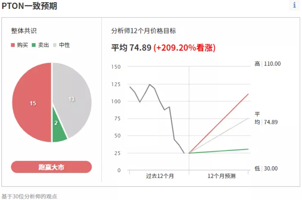 一个有意思的现象是,虽然近期Peloton的股价仍然节节败退,但是华尔街分析师似乎充满信心。根据英为财情Investing.com的一致预期工具显示,在我们调查的30位分析师中,有15位分析师给予该公司“买入”评级,13位给予公司“中性”评级,仅有2位建议“卖出”,而该股的12个月目标价平均值高达74.89美元,较当前股价水平有209.20%的涨幅空间。