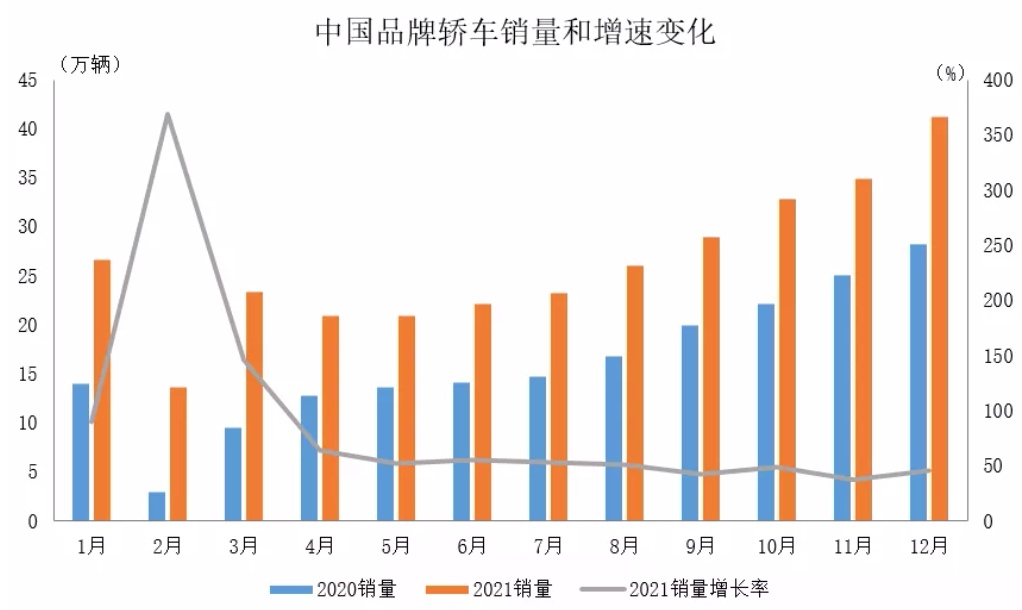 智通财经APP获悉,据中国汽车工业协会统计分析,2021年,中国品牌市场表现明显好于大市。2021年12月,中国品牌乘用车共销售113.7万辆,环比增长11.2%,同比增长10%,占乘用车销售总量的46.9%,占有率比上月提升0.3个百分点,比上年同期提升3.4个百分点。2021年,中国品牌乘用车共销售954.3万辆,同比增长23.1%,占乘用车销售总量的44.4%,占有率比上年同期提升6.0个百分点。