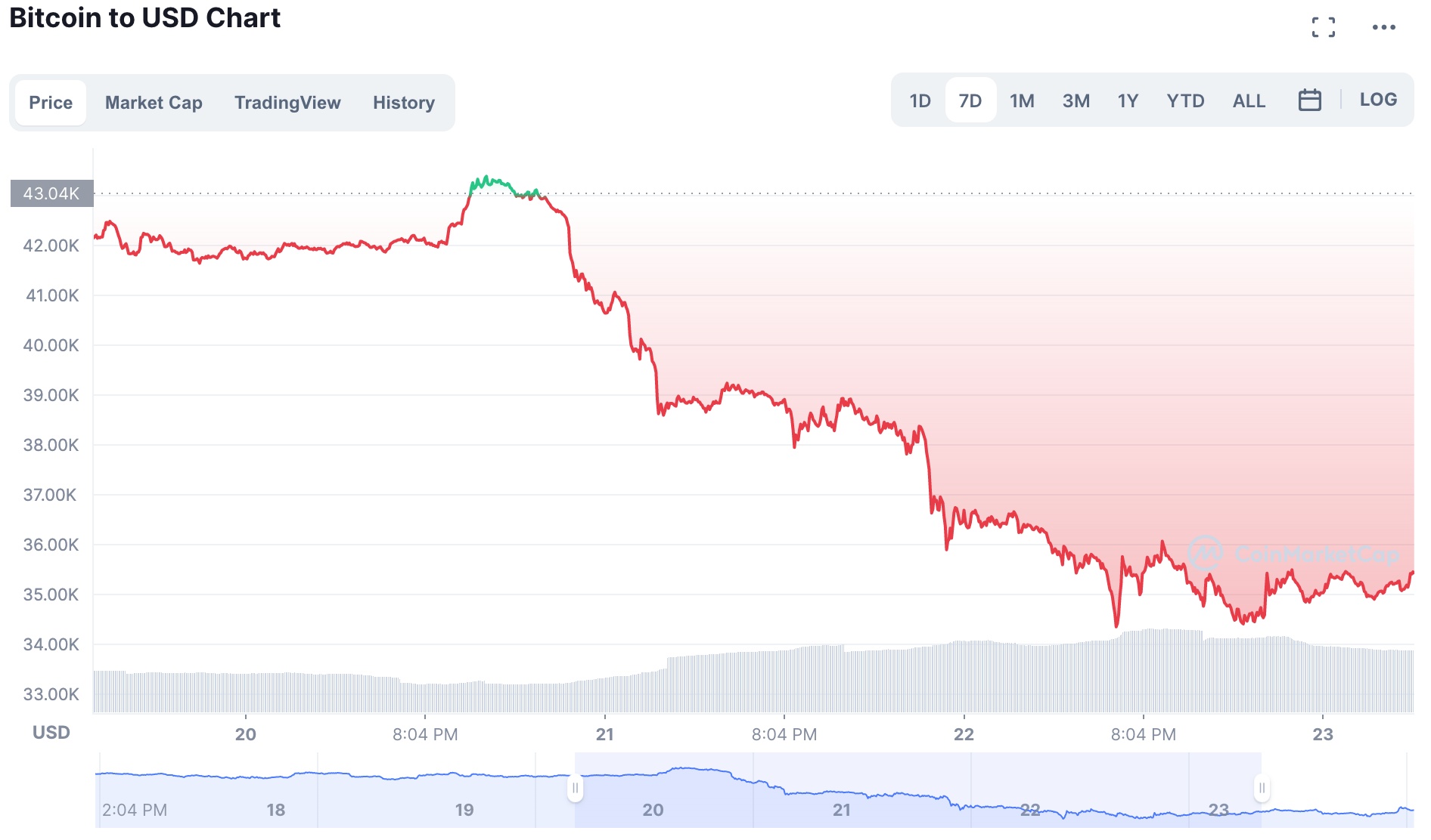 数据显示,比特币上周六一度跌至34,042.78美元,跌幅为7.2%,之后跌幅有所收窄。其他加密货币同样下跌:根据Coinbase的数据,以太坊下跌12%,Solana和Cardano均下跌了至少17%。