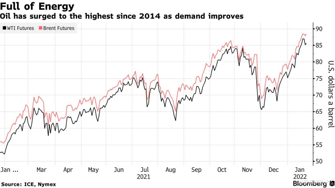 原油在新的一年开局强劲。由于需求前景上升、库存下降,包括高盛在内的华尔街顶级银行发布了乐观的石油预测,原油价格上周飙升至2014年以来的最高水平,今年以来已经上涨了10%以上。与此同时,投资者正在权衡俄罗斯入侵乌克兰的可能性以及美国收紧货币政策的前景。