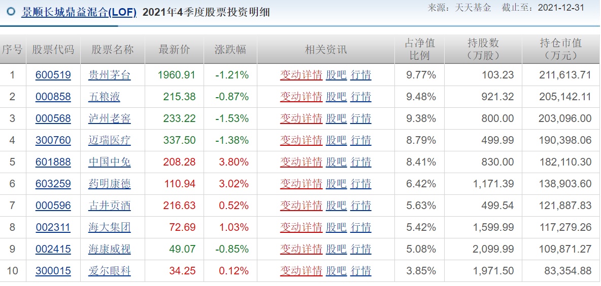 刘彦春管理的另外一只过百亿的基金景顺长城鼎益混合的股票持仓比例为89.20%,较三季度末的90.59%稍有下降。前十大重仓股也没有变化,分别为贵州茅台(600519.SH)、五粮液(000858.SZ)、泸州老窖(000568.SZ)、迈瑞医疗(300760.SZ)、中国中免(601888.SH)、药明康德(603259.SH)、古井贡酒(000596.SZ)、海大集团(002311.SZ)、海康威视(002415.SZ)、爱尔眼科(300015.SZ)。相较三季度而言,贵州茅台,五粮液,泸州老窖也均被减仓。