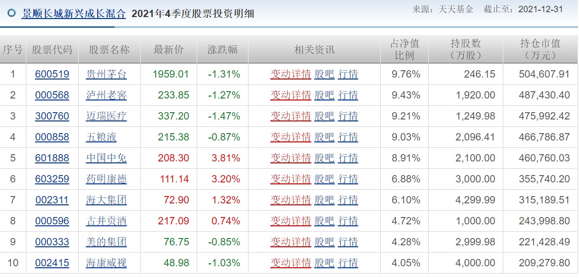 以景顺长城新兴成长为例,四季度,景顺长城新兴成长混合股票持仓比例为91.40%,较三季度末的92.36%亦有下降。该基金前十大重仓股较三季度没有变化,分别为贵州茅台(600519.SH)、泸州老窖(000568.SZ)、迈瑞医疗(300760.SZ)、五粮液(000858.SZ)、中国中免(601888.SH)、药明康德(603259.SH)、海大集团(002311.SZ)、古井贡酒(000596.SZ)、美的集团(000333.SZ)、海康威视(002415.SZ)。贵州茅台虽被减仓但仍升至第一大重仓股,持股数量为246.15万股,较三季度末的291.34万股有所下降。泸州老窖与五粮液的持仓股数较三季末均有所下降,唯一得到加仓的是中国中免。
