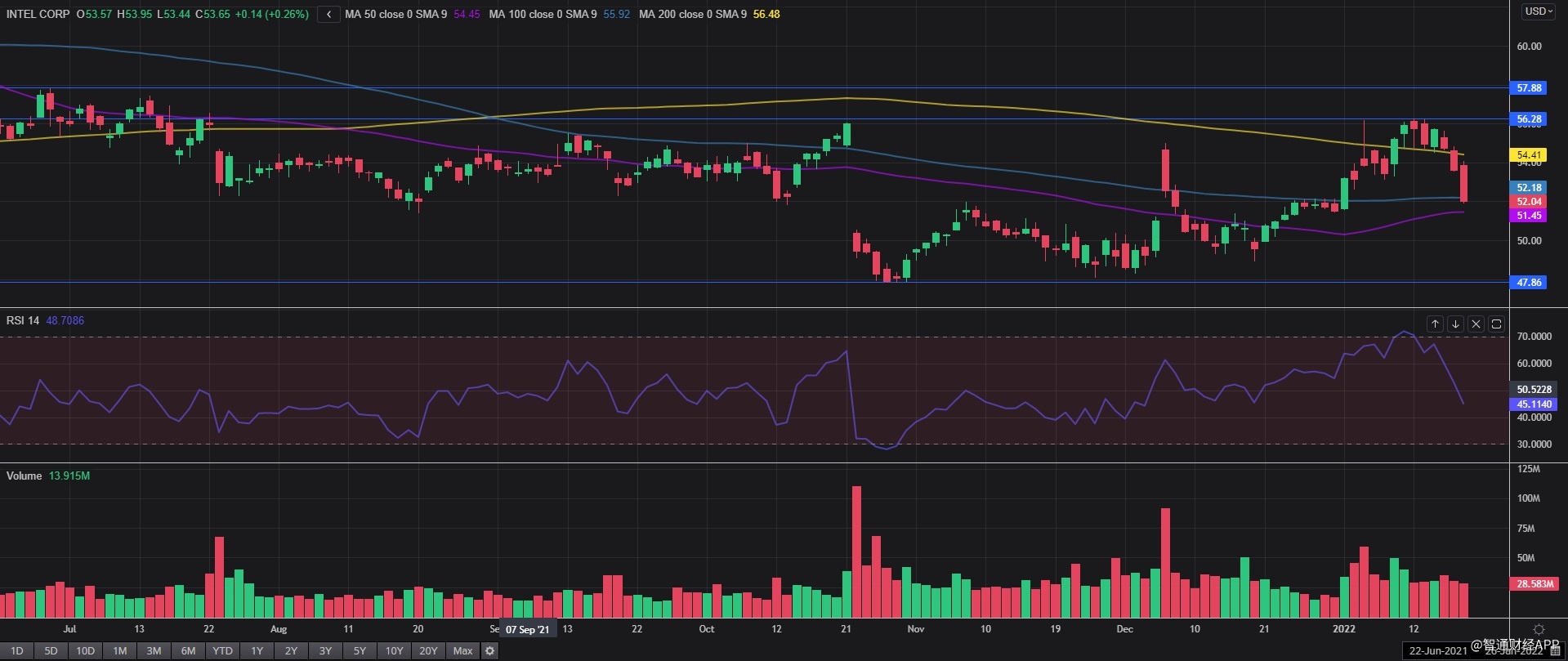 City Index资深分析师Joshua Warner表示,在跌破100日移动均线后,英特尔股价现在正在测试2021年最后几个交易日出现的52美元阻力位。技术面上出现“三只黑乌鸦”形态的迹象,预示该股可能会进一步下跌。 50日移动均线低于100日移动均线,而100日移动均线又在200日移动均线下方,技术面正在发出看跌信号,而相对强弱指数(RSI)最近也处于看跌区域。