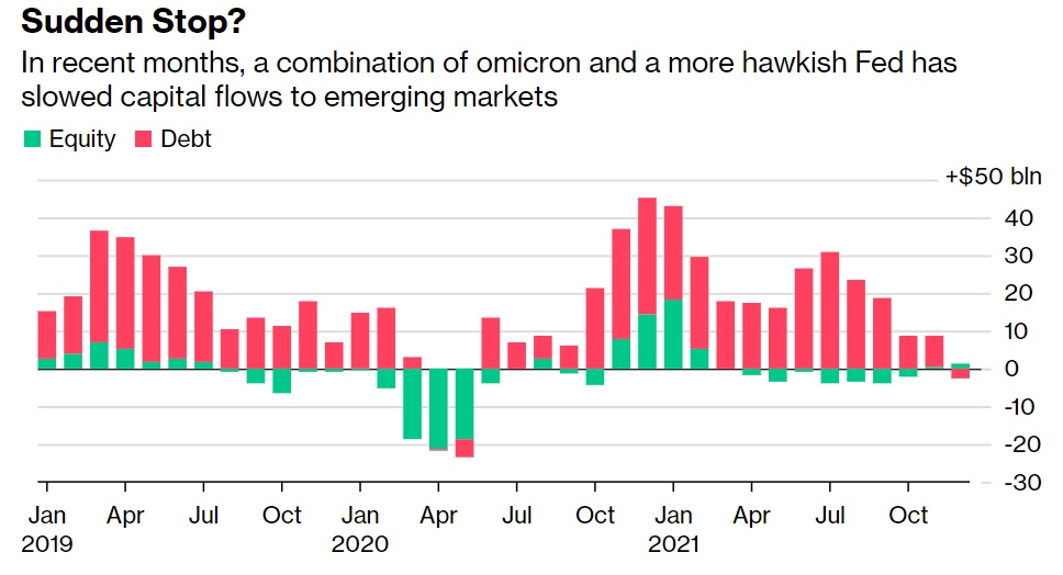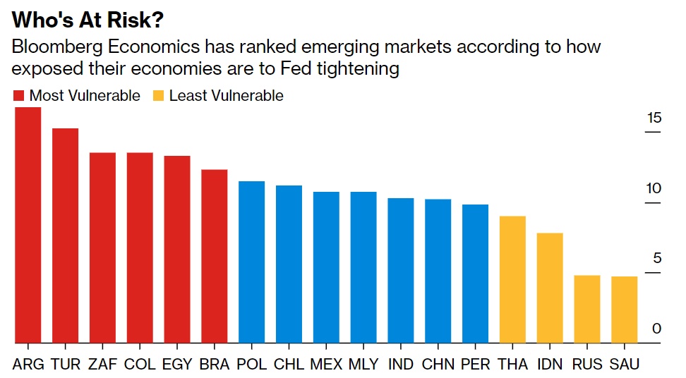 美联储承诺将在今明两年提高利率,而加息的前景通常不利于发展中经济体,尤其是在美元走强的情况下。2013年所谓的“缩减恐慌”(taper tantrum)和墨西哥上世纪90年代的崩盘在历史上引人注目。不过,2022年的好消息是,有理由认为这次的影响可能没那么严重。