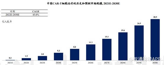 另外,中国作为最大的人口国,对CAR-T细胞治疗的需求与日俱增。根据弗若斯特沙利文报告,在癌症患者增加、政策优惠和患者负担能力提高的推动下,2024年和2030年市场规模将分别进一步增长至53亿元和289亿元,2024年至2030年CAGR将达到32.6%。