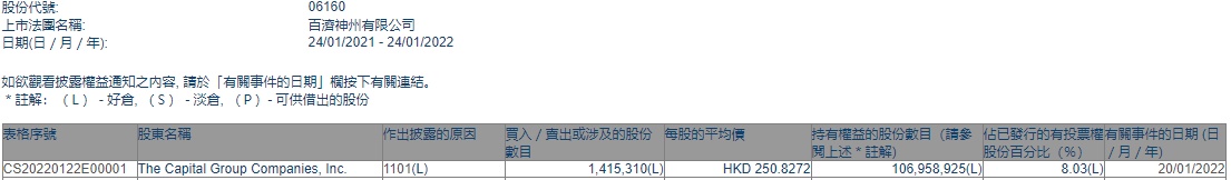 智通财经APP获悉,香港联交所最新资料显示,1月20日,美国资本集团增持百济神州(06160)141.531万股,每股作价250.8272港元,总金额约为3.55亿港元。增持后最新持股数目约为1.07亿股,最新持股比例为8.03%。