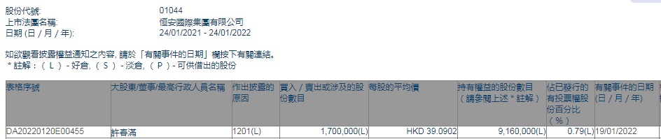 智通财经APP获悉,香港联交所最新资料显示,1月19日,许春满减持恒安国际(01044)170万股,每股作价39.0902港元,总金额约为6645.33万港元。减持后最新持股数目为916万股,最新持股比例为0.79%。