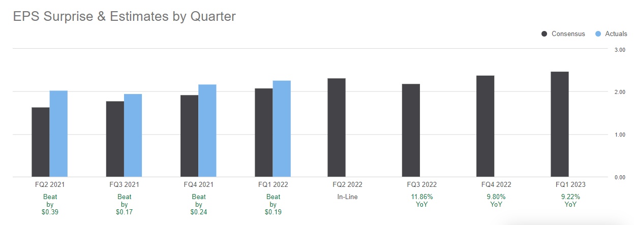 股价表现方面,微软股价自去年年底以来一直呈下跌趋势,截至发稿,当前该股股价为296.30美元,为去年10月中旬以来的最低水平。但券商依然看好微软,认为该股股价有22%的上行潜力,48名券商设定的平均目标价为371.23美元。此外,如图2所示,当微软公布优于市场预期的财务业绩时,都对微软股价有一定的提振作用。