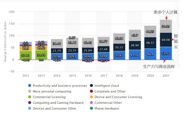 图3可见,自2014年微软进行“云转型”以来,智能云业务在2020财年已成为微软的核心支柱业务,另外两大支柱是生产力和商业流程(主打Office系列产品)与更多个人计算(以Windows、Surface和Xbox为代表)业务。