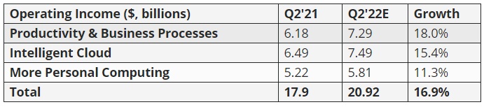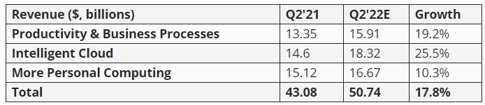 而在即将公布的Q2财报中,智能云业务预计仍是该公司营收增长最高的业务。分析师预计该业务营收将增长25.5%至183.2亿美元,其中Azure云平台在Q2销售额同比增幅将超过40%,较上季度50%的增幅有所放缓,但因企业数字化需求依然强劲,该服务前景预计仍向好。