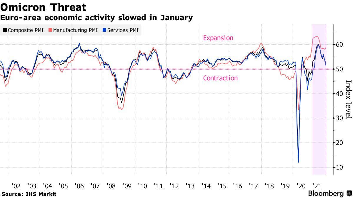 随着奥密克戎变异病毒及高通胀席卷欧洲服务业和制造业,欧元区经济活动降至近一年来的最低水平。尽管制造业供应链中断的情况有所改善,但根据IHS Markit周一发布的PMI数据,欧元区综合PMI指数连续第二个月下降,从去年12月的53.3降至今年1月的52.4,低于预期的52.6。