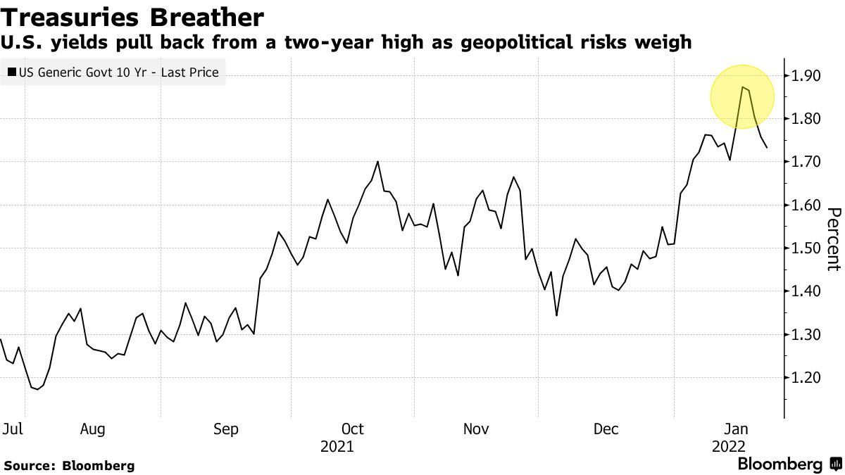 在经历了数十年来最糟糕的年初开具之后,美国国债价格实现上涨,原因之一是俄罗斯和乌克兰之间的紧张关系刺激了投资者对最安全政府债券的需求。10年期美债收益率连续第四日下跌,上周曾飙升至逾两年来最高水准。同样被视为避风港的德国国债收益率也在周一出现下跌,此前曾短暂转为正值,这是10年期德债收益率2019年5月以来的首次“转正”。