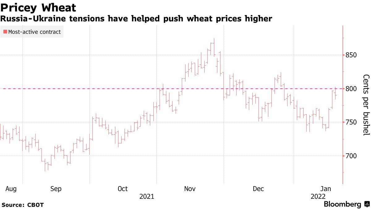 小麦期货价格自去年12月以来首次突破8美元大关,原因是市场担心局势升级后可能出现小麦贸易中断。