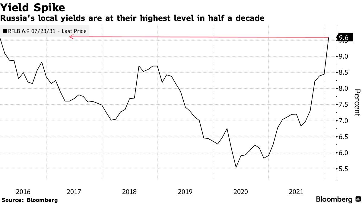 随着紧张局势的加剧,俄罗斯国内市场受到了沉重打击,促使财政部取消了上周的定期债券拍卖,债券收益率升至5年来的最高水平。