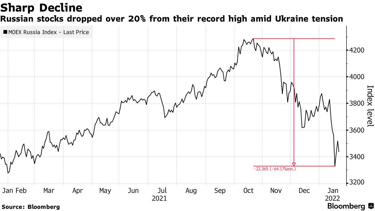 摩根士丹利的策略师们预计,如果局势出现实质性升级,MSCI 俄罗斯指数将下跌达27%。俄罗斯股市已经是世界上表现最糟糕的股市之一,但在上周末,由于有媒体报道称华盛顿允许一些波罗的海国家向乌克兰运送美国制造的武器,俄罗斯股市短暂出现回暖。俄罗斯的拟公司可能会搁置任何上市计划,等待股价回升后再考虑进行。