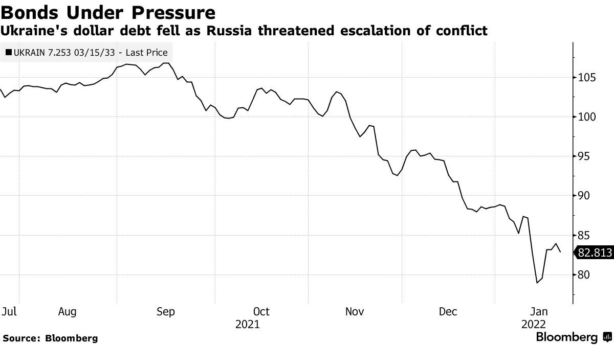 根据Bloomberg指数,乌克兰外国债券今年以美元计下跌幅度达7.5%,是新兴市场中表现最差的债券,仅次于阿根廷。2033年到期的债券最后一次以或高于票面价值的价格交易还是在去年11月中旬,周一早盘该债券价格再次下跌。乌克兰货币格里夫纳也在下跌,该货币兑美元汇率跌至一年多来的最低水平。