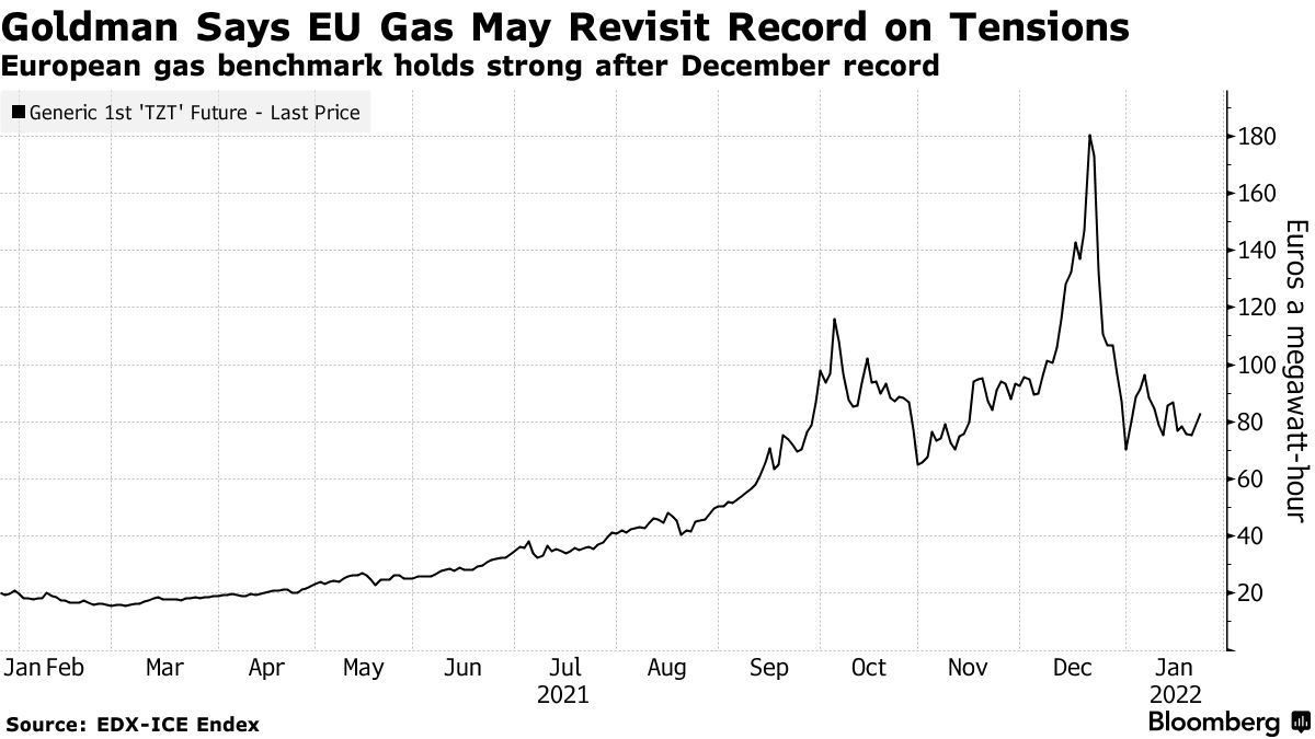 高盛分析师在一份报告中写道:“任何局势升级都可能引发对该项目的制裁,可能会无限期减少流向欧洲的天然气和金融类资金,同时将天然气价格推至新高。”几个月来,俄罗斯对欧洲大陆的天然气流量一直处于下降水平,这加大了该地区几乎已见底天然气库存的压力。