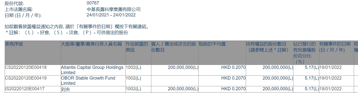 智通财经APP获悉,香港联交所最新资料显示,1月19日,西泽投资管理有限公司下属OBOR Stable Growth Fund Limited(带路稳定增长基金有限公司)场外购入中基长寿科学(00767)2亿股,每股作价0.207港元,总金额为4140万港元。购入后最新持股数目为2亿股,最新持股比例为5.17%。