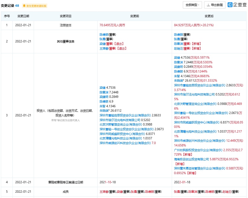 智通财经APP获悉,企查查App显示,1月21日,微源光子(深圳)科技有限公司发生工商变更,新增股东海南极目创业投资有限公司(小米关联公司)等,同时企业注册资本增至约85万人民币。