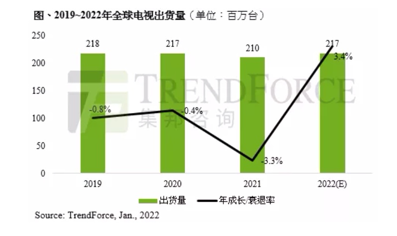智通财经APP获悉,根据TrendForce集邦咨询调查显示,2021年电视品牌上半年出货表现受惠于美国救济金所带动,使得北美出货持续畅旺,与此同时,品牌持续进行面板库存回补,推升面板价格不断攀高;下半年随着欧美疫情趋缓生活恢复正轨,疫情红利不再,需求面临考验。此外,原物料和运费高涨垫高整机成本,品牌业者不得不将成本转嫁至终端售价,尽管品牌仍期望年底双十一及黑五两大促销假期,但是受到成本过高导致促销成效不彰,而终端需求也就此一蹶不振,最终使2021年电视出货量年衰退3.2%,达2.1亿台。