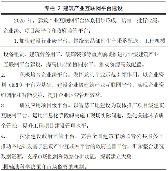 加大建筑产业互联网平台基础共性技术攻关力度,编制关键技术标准、发展指南和白皮书。开展建筑产业互联网平台建设试点,探索适合不同应用场景的系统解决方案,培育一批行业级、企业级、项目级建筑产业互联网平台,建设政府监管平台。鼓励建筑企业、互联网企业和科研院所等开展合作,加强物联网、大数据、云计算、人工智能、区块链等新一代信息技术在建筑领域中的融合应用。