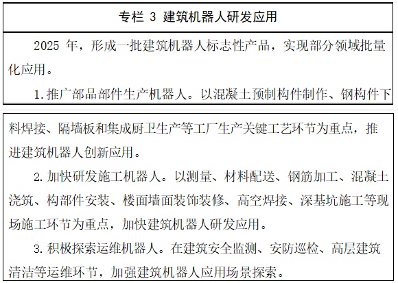 加强新型传感、智能控制和优化、多机协同、人机协作等建筑机器人核心技术研究,研究编制关键技术标准,形成一批建筑机器人标志性产品。积极推进建筑机器人在生产、施工、维保等环节的典型应用,重点推进与装配式建筑相配套的建筑机器人应用,辅助和替代“危、繁、脏、重”施工作业。推广智能塔吊、智能混凝土泵送设备等智能化工程设备,提高工程建设机械化、智能化水平。