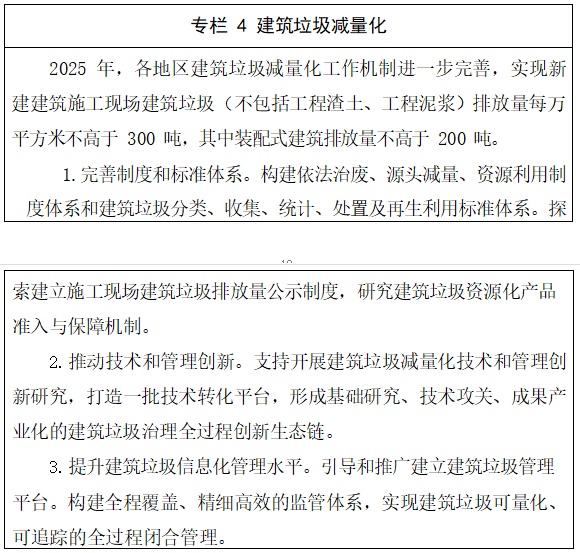——绿色低碳生产方式初步形成。绿色建造政策、技术、实施体系初步建立,绿色建造方式加快推行,工程建设集约化水平不断提高,新建建筑施工现场建筑垃圾排放量控制在每万平方米300吨以下,建筑废弃物处理和再利用的市场机制初步形成,建设一批绿色建造示范工程。
