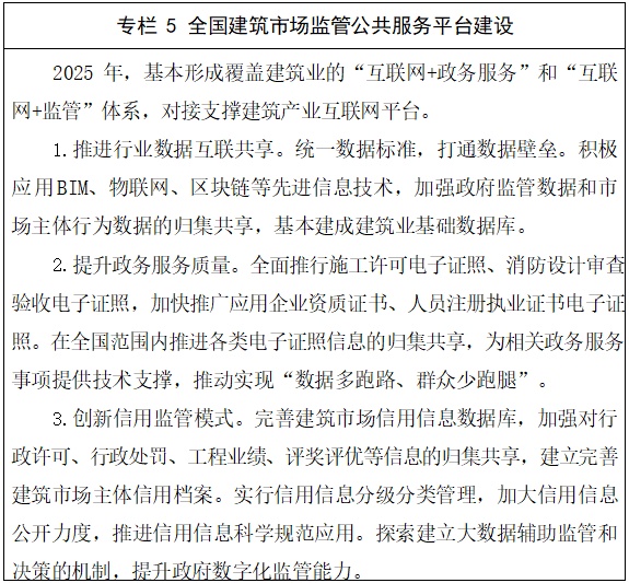 ——建筑市场体系更加完善。建筑法修订加快推进法律法规体系更加完善。企业资质管理制度进一步完善,个人执业资格管理进一步强化,工程担保和信用管理制度不断健全,工程造价市场化机制初步形成。工程建设组织模式持续优化,工程总承包和全过程工程咨询广泛推行。符合建筑业特点的用工方式基本建立,建筑工人实现公司化、专业化管理,中级工以上建筑工人达1000万人以上。